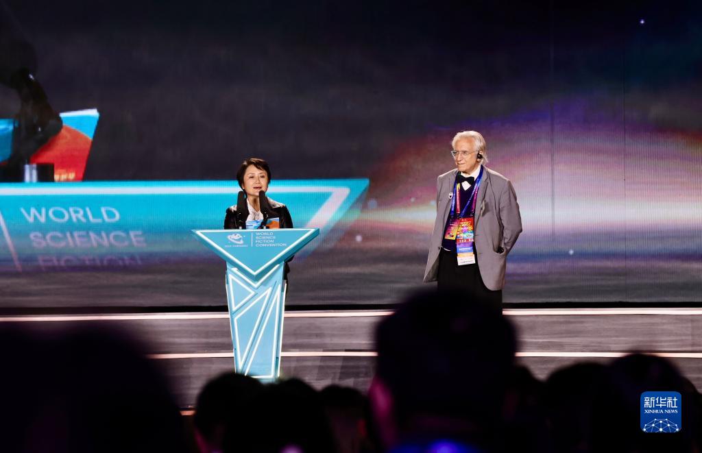 10月22日晚,在第81屆世界科幻大會閉幕式上,2023成都世界科幻大會專職主席梁效蘭(左)致辭。