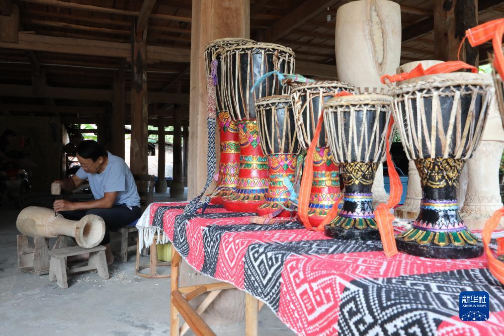 10月18日,云南景洪市勐罕鎮(zhèn)曼聽(tīng)村的非遺傳承人波應(yīng)章在制作象腳鼓。他制作的象腳鼓很受游客歡迎。