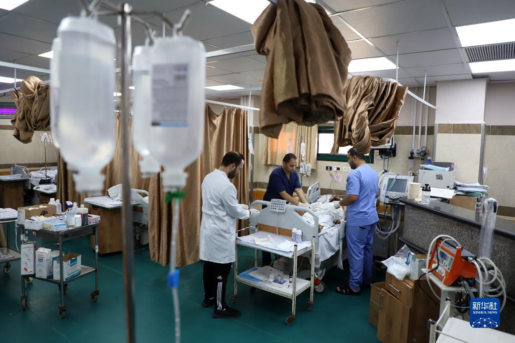 10月22日,在加沙地帶南部城市汗尤尼斯的納賽爾醫(yī)院,醫(yī)務(wù)人員救治在以色列空襲中受傷的巴勒斯坦人。