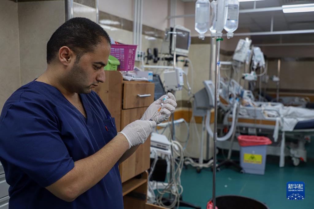 10月22日,在加沙地帶南部城市汗尤尼斯的納賽爾醫院,醫務人員救治在以色列空襲中受傷的巴勒斯坦人。
