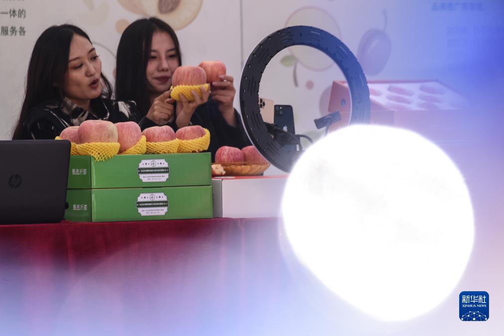 10月22日,工作人員在山東沂源蘋果節電商銷售大賽上直播帶貨。