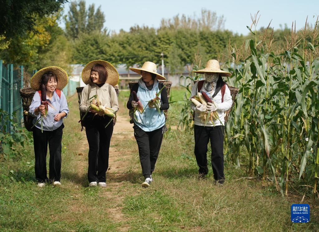 王翠云(左一)與村民一起在北臺頭村一處玉米地采摘玉米(10月4日攝)。