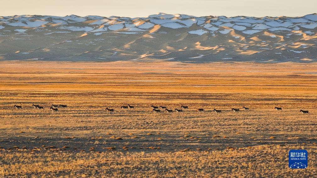 10月18日,在阿爾金山國家級自然保護區,藏野驢在灑滿陽光的草原上奔馳(無人機照片)。