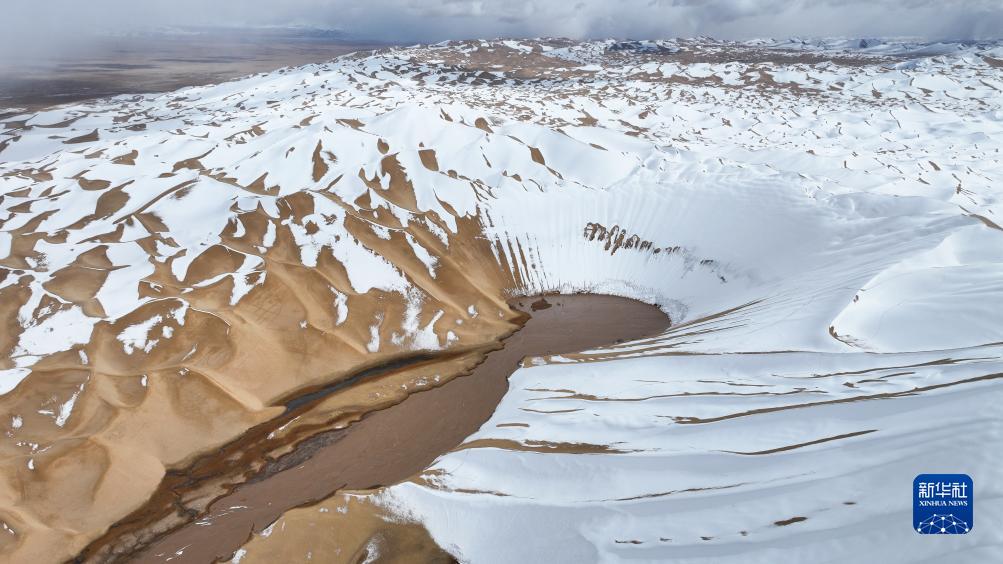 10月16日在阿爾金山國家級自然保護區拍攝的白雪覆蓋的大沙子泉(無人機照片)。