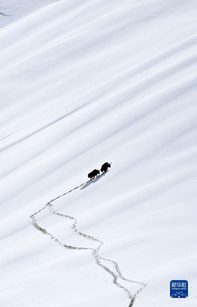 10月16日,在阿爾金山國家級自然保護區(qū),野牦牛攀爬雪后的庫木庫里沙漠。
