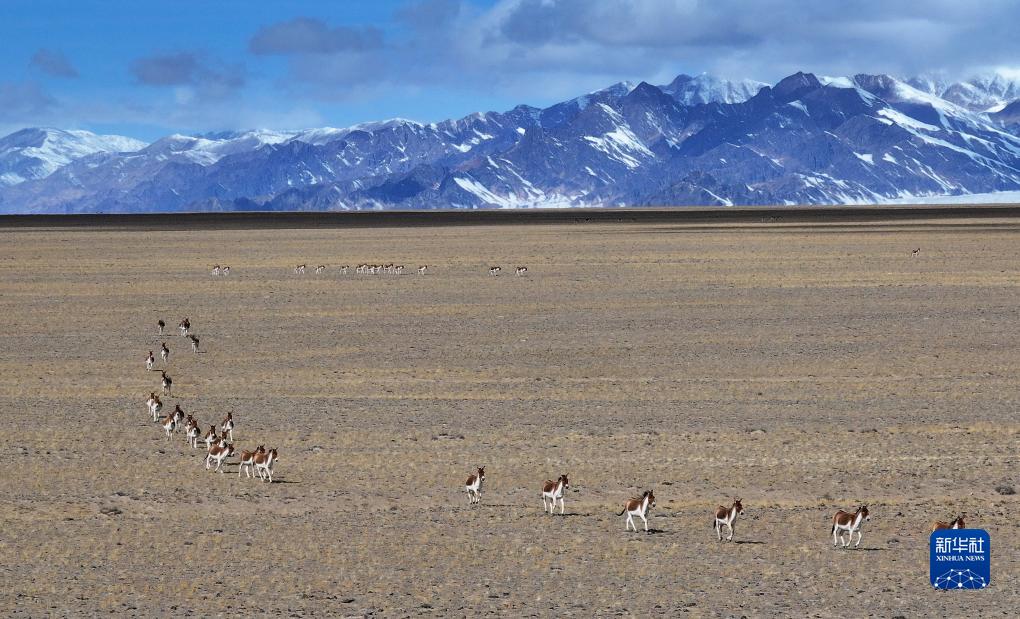10月17日,在阿爾金山國家級自然保護區(qū),藏野驢在草原上奔跑(無人機照片)。