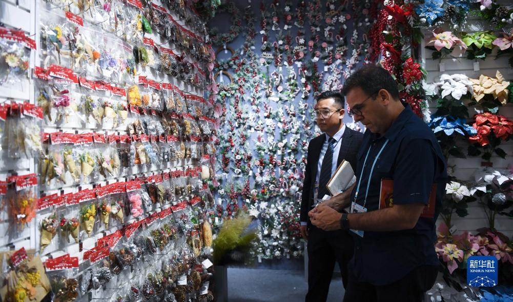 10月23日,外國采購商在飾品展臺洽談業務。