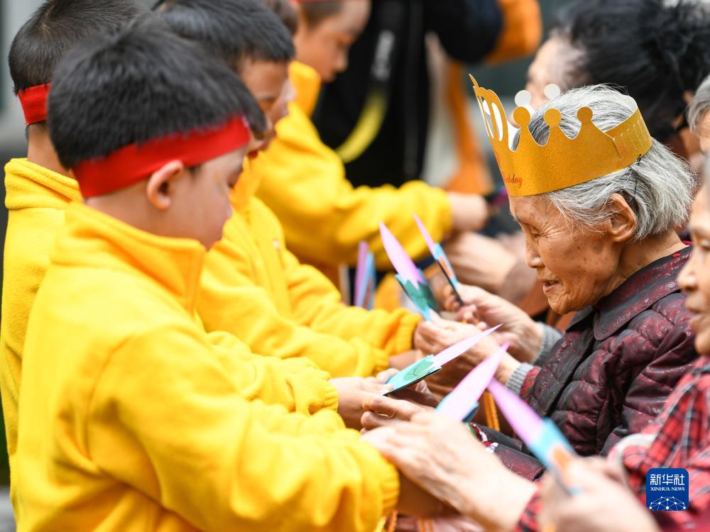 10月20日,在四川省眉山市彭山區社會福利院,彭山區幼兒園的小朋友為趙鳳章老奶奶送上祝壽賀卡。