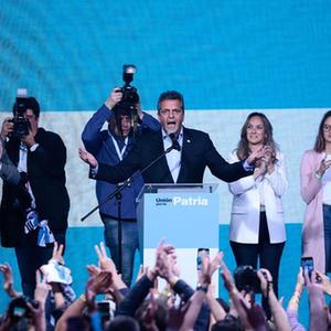 10月22日,阿根廷中左翼執(zhí)政聯(lián)盟祖國聯(lián)盟候選人、現(xiàn)任經(jīng)濟部長塞爾希奧·馬薩(中)在位于首都布宜諾斯艾利斯的競選總部發(fā)表演說。