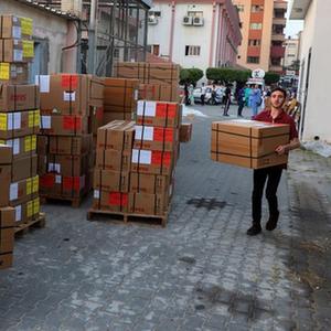 10月23日,在加沙地帶南部城市汗尤尼斯,一名工作人員搬運救援物資。