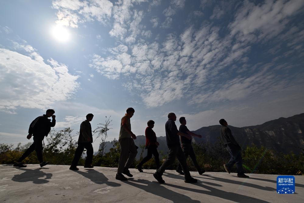 在壺關縣大峽谷鎮青龍峽村,村民們在修路間隙到山下休息(10月17日攝)。