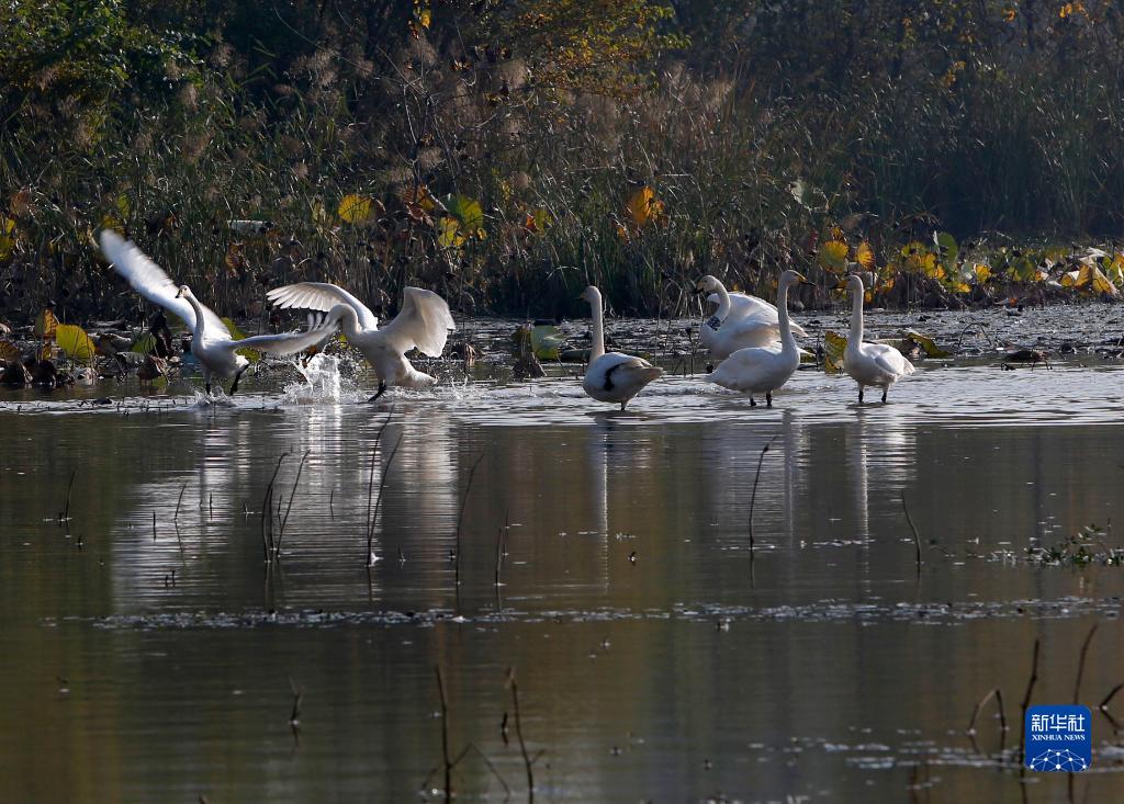 10月24日,大天鵝在三門(mén)峽市天鵝湖國(guó)家城市濕地公園內(nèi)棲息。