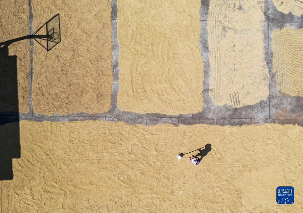 10月24日,廣西貴港市港北區(qū)大圩鎮(zhèn)村民在晾曬稻谷(無人機(jī)照片)。