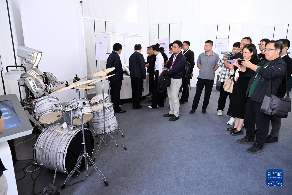 10月24日,觀眾在第六屆世界聲博會上參觀一款會打架子鼓的機器人。