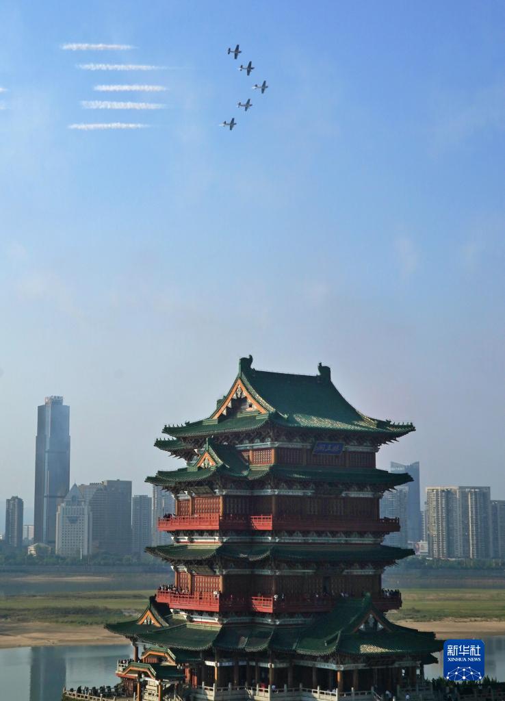 10月24日,歐洲環(huán)球之星特技飛行表演隊在南昌滕王閣景區(qū)上空進行飛行表演。