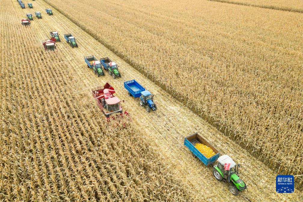 10月18日,收割機在黑龍江省綏化市北林區(qū)張維鎮(zhèn)潤地農(nóng)業(yè)種植合作社的一處玉米地收獲玉米(無人機照片)。
