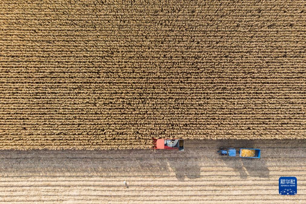 10月19日,在黑龍江省肇東市五里明鎮東升村,農民駕駛收割機在收獲玉米(無人機照片)。