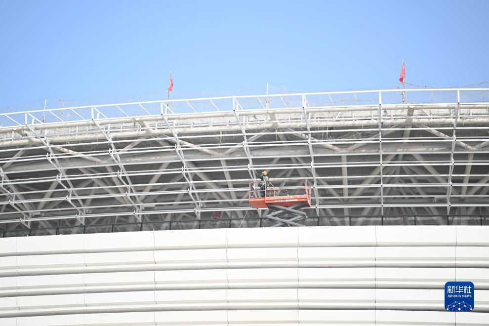 工人在雄安體育中心體育場施工(10月24日攝)。