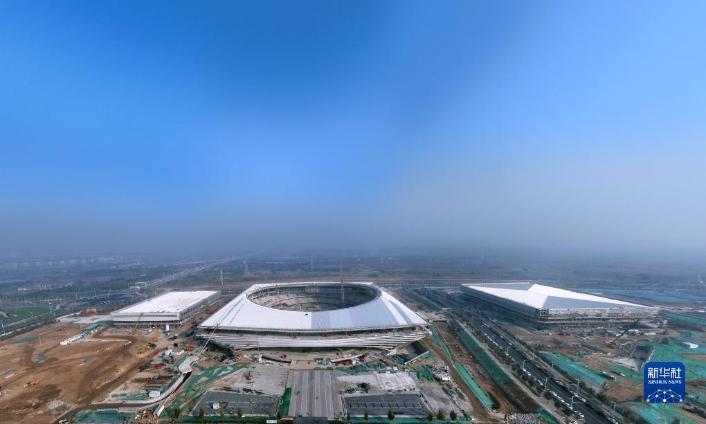 建設中的雄安體育中心體育場(中)、體育館(右)和游泳館(10月24日攝,無人機照片)。