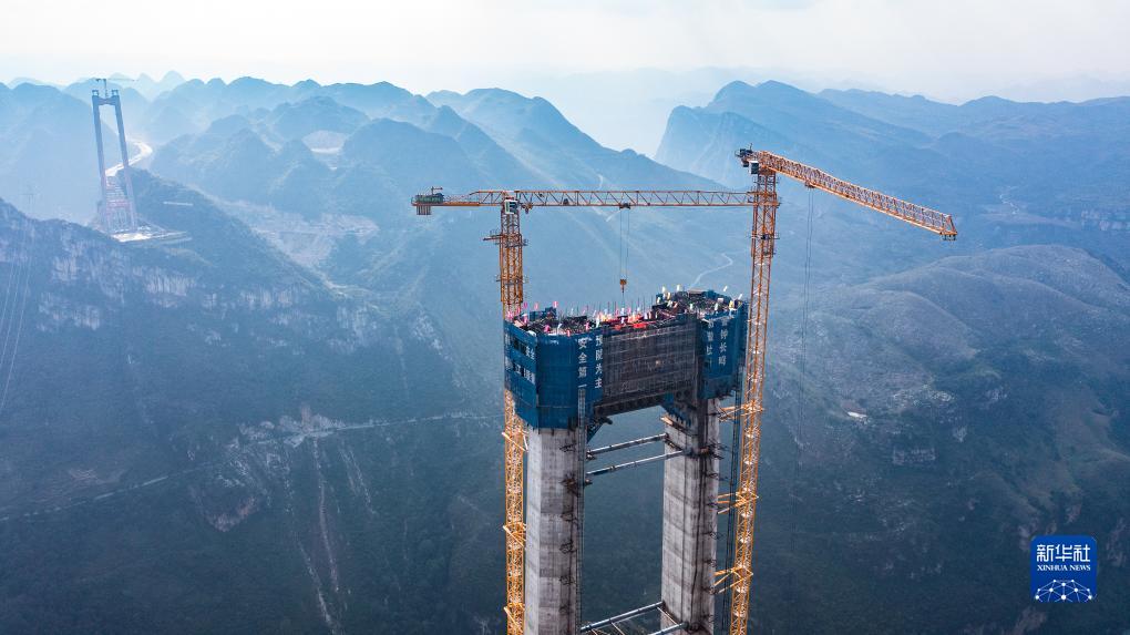 10月24日拍攝的六安高速花江峽谷大橋5號主塔(無人機照片)。