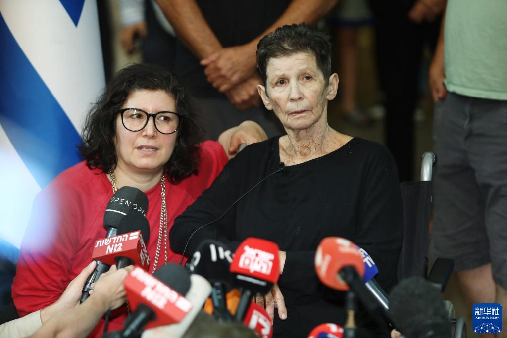 10月24日,獲釋的以色列被扣押人員約赫韋德· 利夫希茨(右)在以色列特拉維夫接受采訪。