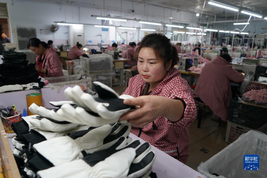 10月25日,辛集市辛集鎮安古城村一家手套生產企業的工人在制作手套。