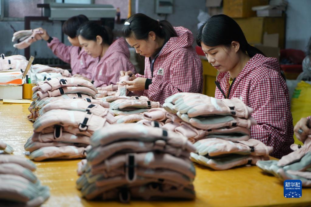 10月25日,辛集市辛集鎮安古城村一家手套生產企業的工人檢查手套產品質量。
