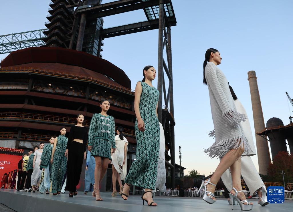 模特在北京首鋼園三高爐南廣場走秀(2022年9月1日攝)。首鋼凝結(jié)著首都的工業(yè)記憶,經(jīng)過重新設(shè)計與改造,以三高爐為代表的首鋼工業(yè)地標(biāo)煥發(fā)新活力,助力首都高質(zhì)量發(fā)展。