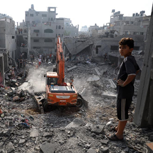10月25日,在加沙地帶南部城市汗尤尼斯,挖掘機(jī)在以色列空襲后的建筑廢墟現(xiàn)場(chǎng)作業(yè)。