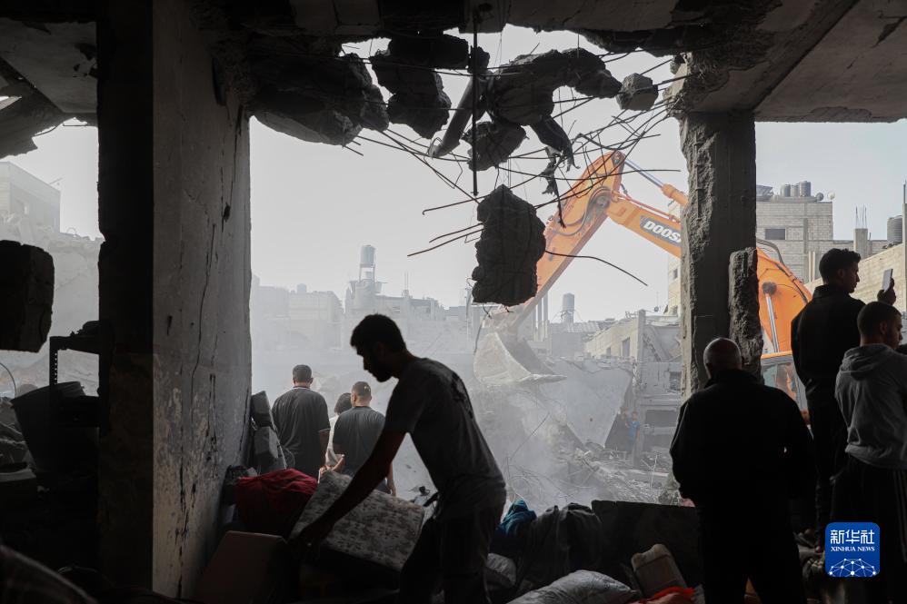 10月25日,在加沙地帶南部城市汗尤尼斯,當(dāng)?shù)鼐用駠^挖掘機(jī)在以色列空襲后的建筑廢墟現(xiàn)場作業(yè)。