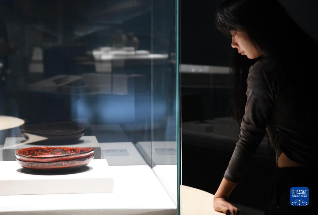 10月25日,觀眾在秦始皇帝陵博物院觀看荊州博物館館藏文物鳥紋漆盂。