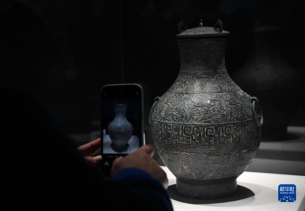 10月25日,觀眾在秦始皇帝陵博物院觀看成都博物館館藏文物狩獵紋銅壺。