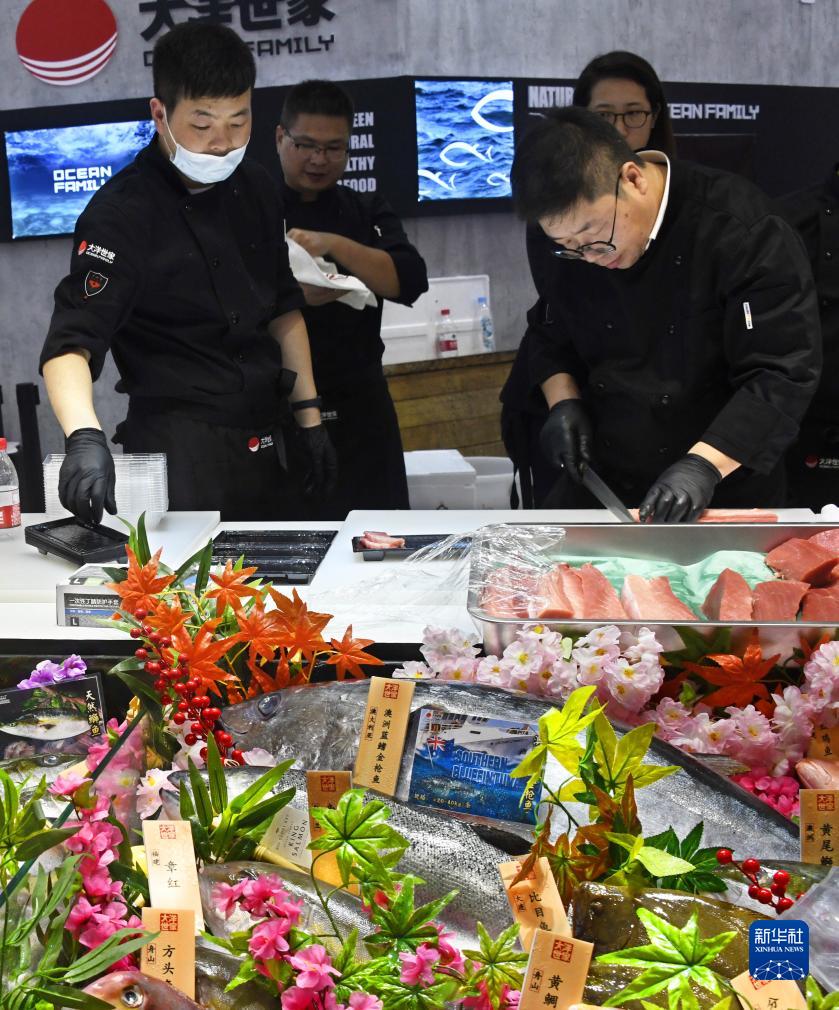 10月25日,參展企業在漁業博覽會上展示、加工水產品。