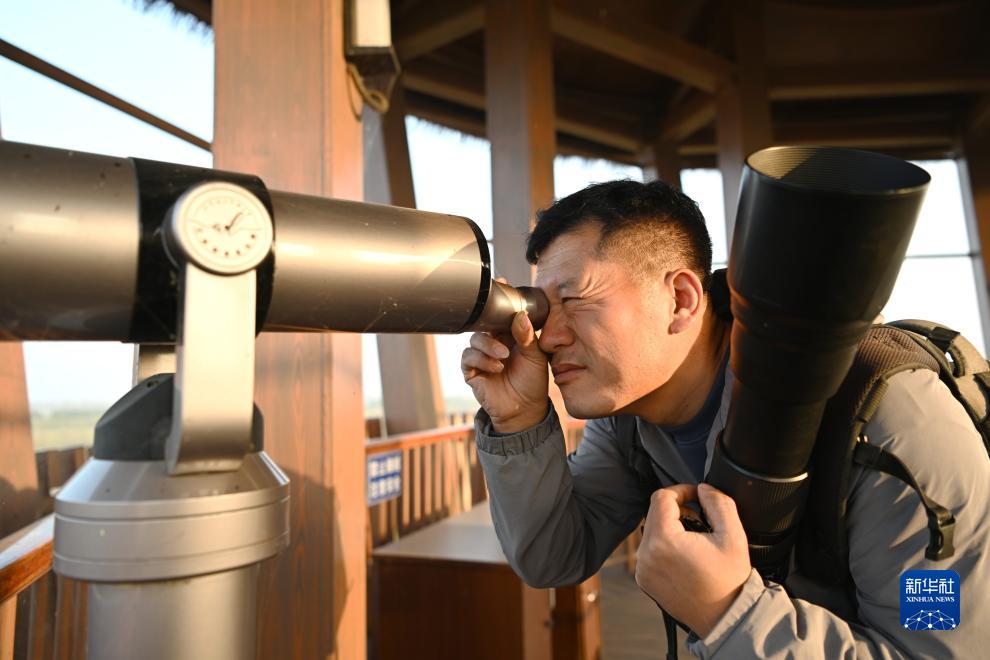 10月24日,韓戰(zhàn)橋在雄安新區(qū)孝義河河口濕地瞭望塔上用望遠(yuǎn)鏡觀測野生鳥類。