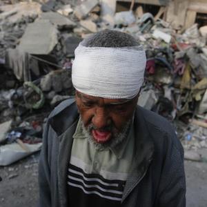 10月25日,在加沙地帶南部城市拉法,一名在以色列空襲中受傷的老人頭部裹著紗布。