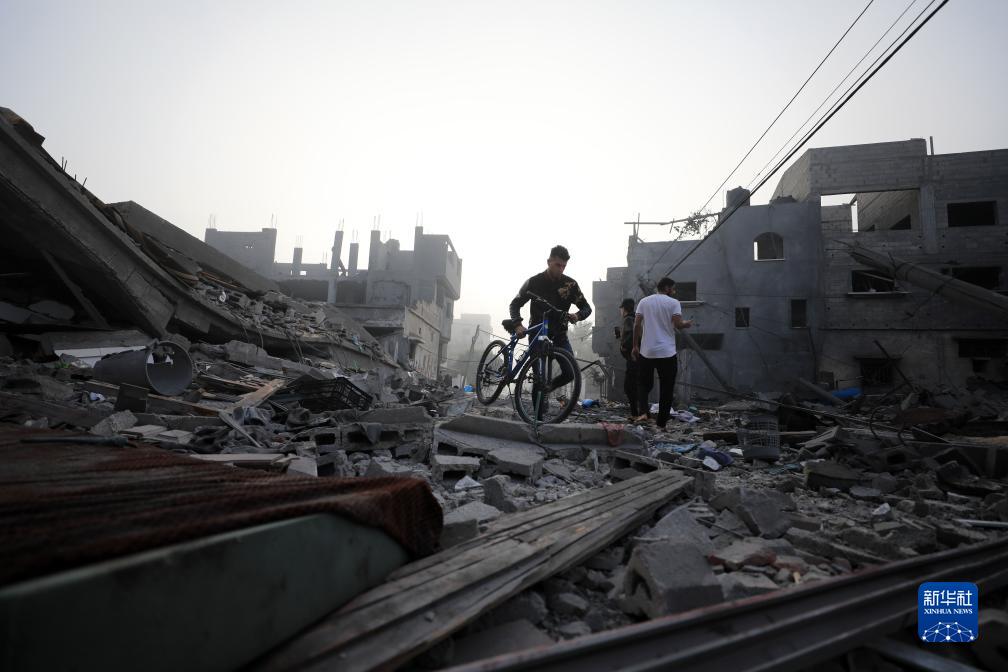 10月25日,在加沙地帶南部城市汗尤尼斯,人們穿過遍布建筑瓦礫的道路。
