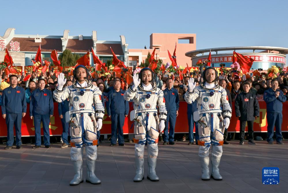 10月26日上午,神舟十七號載人飛行任務航天員乘組出征儀式在酒泉衛星發射中心問天閣圓夢園廣場舉行。這是航天員湯洪波(右)、唐勝杰(中)、江新林在出征儀式上。