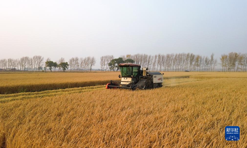 10月25日,收割機在沈陽市沈北新區張家村的稻田中收割水稻(無人機照片)。
