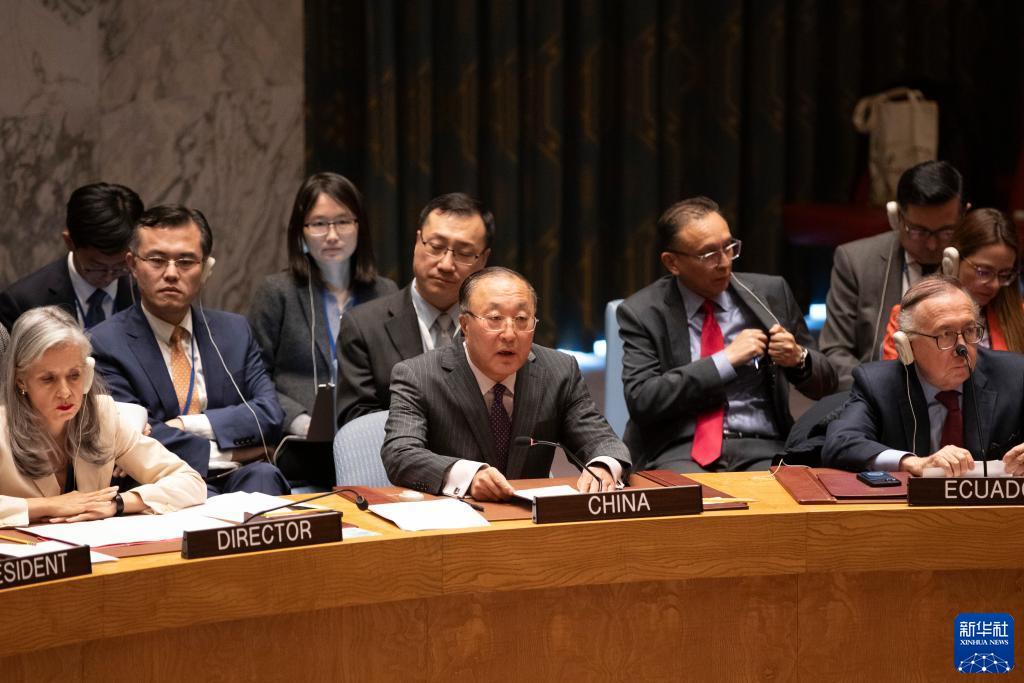 10月25日,在位于紐約的聯合國總部,中國常駐聯合國代表張軍(前排中)在安理會表決涉巴以沖突的決議草案后作解釋性發言。