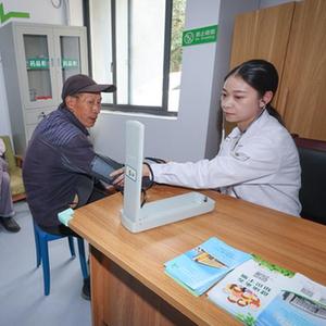 10月26日,在杭州市富陽區湖源鄉居家養老服務中心,社區衛生服務中心醫生為老年人測量血壓。