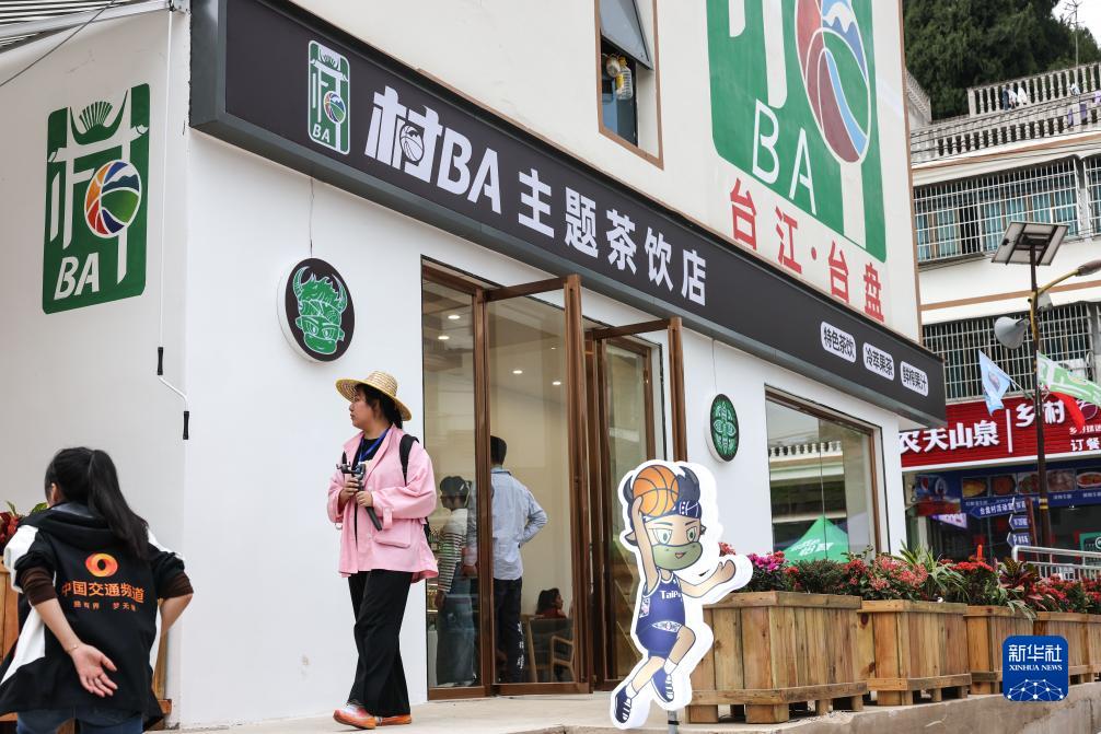 10月25日,游客從“村BA”主題茶飲店前經過。
