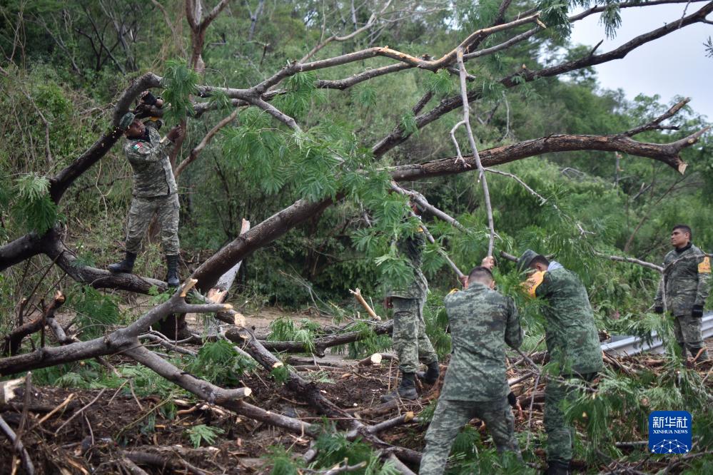 10月25日,在墨西哥格雷羅州奇爾潘辛戈市,軍人清理因颶風(fēng)“奧蒂斯”過境而堵塞的道路。