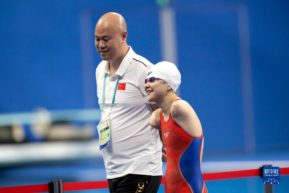 10月25日,盧冬(右)在杭州第4屆亞殘運會女子50米蝶泳S6級決賽后笑著與教練李健輝離開賽場。她最終獲得第四名的成績。