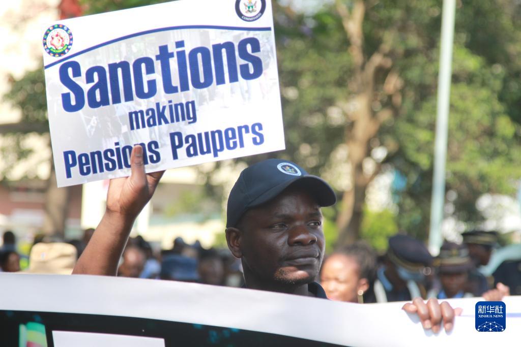 10月25日,在津巴布韋首都哈拉雷,一名男子手持標(biāo)語(yǔ)參加抗議西方非法制裁的游行。
