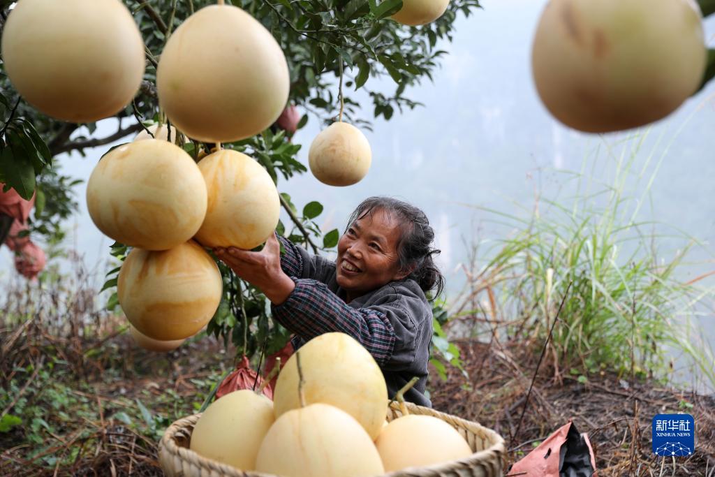 10月26日,村民在貴州省開陽縣花梨鎮(zhèn)清江村蜜柚種植基地里采摘柚子。