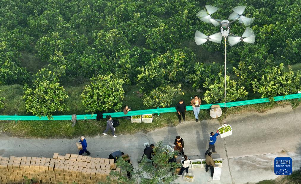 10月24日,湖北省宜昌市秭歸縣歸州鎮屈原廟村村民用無人機運送收獲的柑橘(無人機照片)。