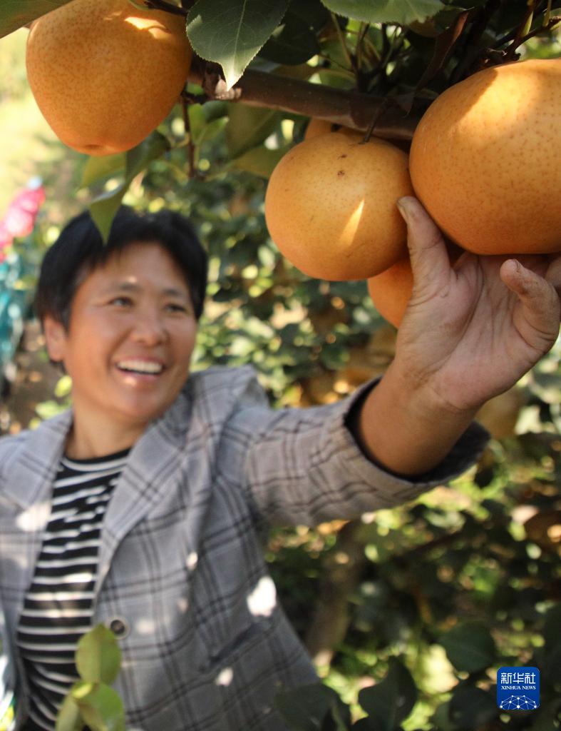 10月9日,在河北省邯鄲市廣平縣平固店鎮南下堡村晚秋黃梨種植基地,農戶在采摘成熟的晚秋黃梨。