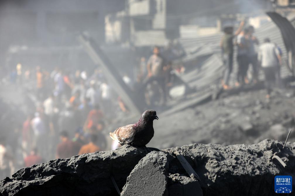 10月26日,在加沙地帶南部城市汗尤尼斯,一只鴿子停留在建筑廢墟上。