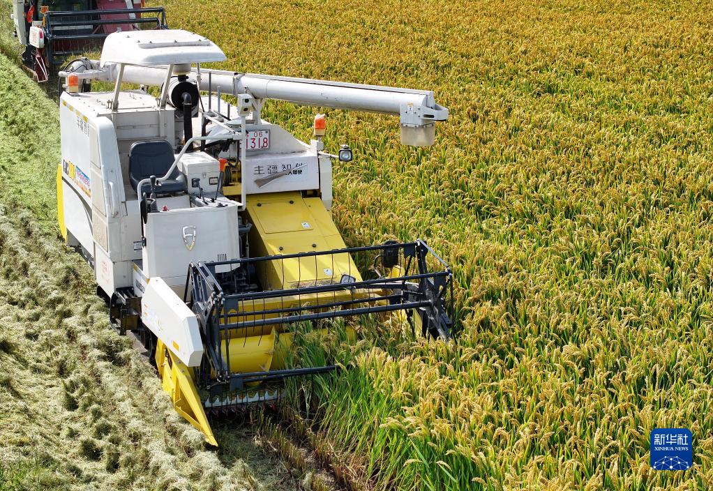 10月27日,無人駕駛機(jī)械在江蘇省南通市通州區(qū)十總鎮(zhèn)育民村高標(biāo)準(zhǔn)農(nóng)田收割水稻(無人機(jī)照片)。