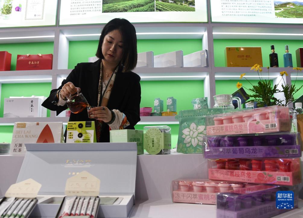 10月27日,在第九屆四川農業博覽會·成都國際都市現代農業博覽會上,一名來自浙江的茶商在展示茶產品。